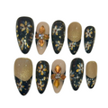 Color: A stunning black and nude French tip base, adorned with handprinted bronze flowers and gold accents.