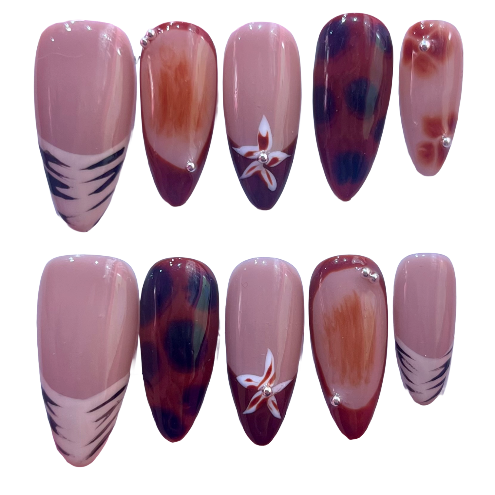Colour: A glossy nude base with brown toned french tips, flowers and tortoise shell details.