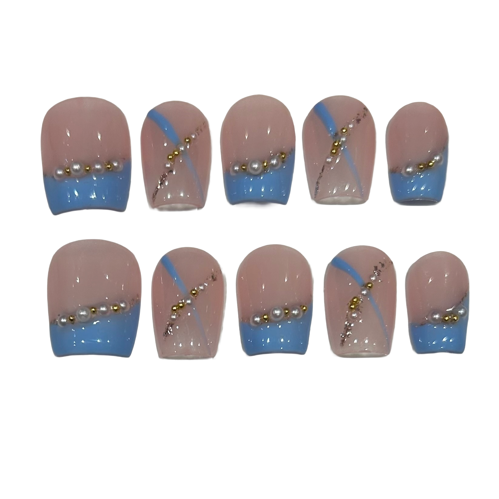 Colour: A pinkish nude base with baby blue french tips, with some added linework adorned with mini pearl charms.