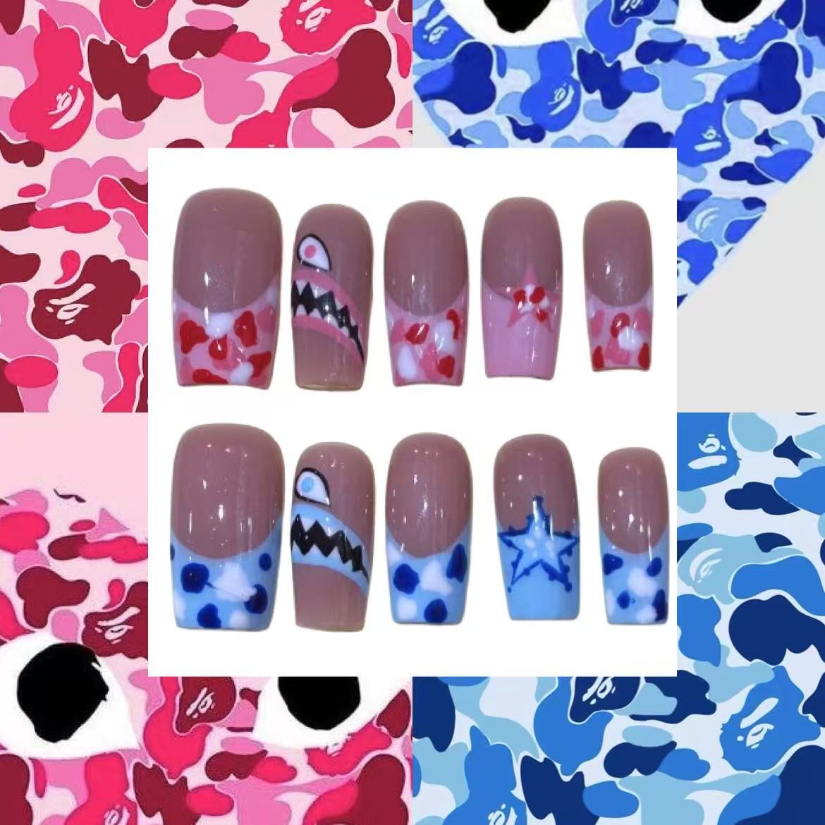Colour: A nude base with pink and blue camo french tips and handpainted quirky face and star designs.