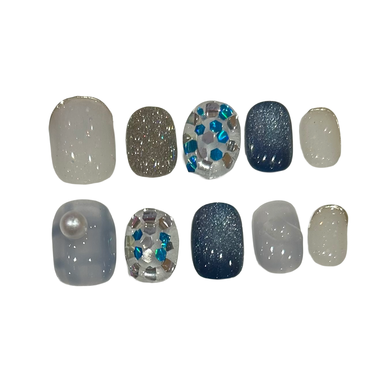 Colour: A blue, white and silver glitter and base, adorned with 3D acrylic encasing stunning glitter, as-well as a statement pearl charm.