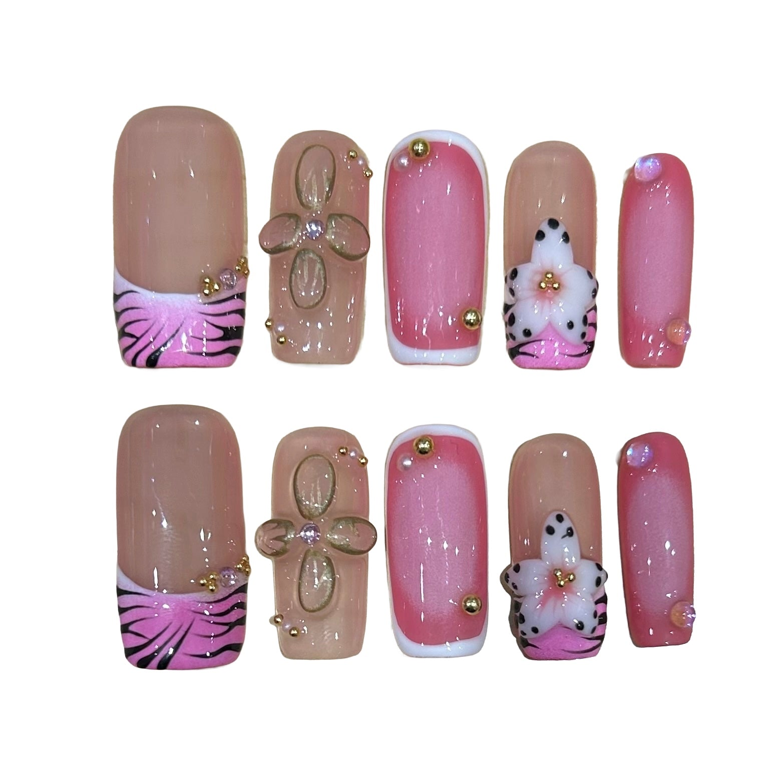 Color: A stunning French tip base, adorned with delicate flowers and pink zebra stripe designs.