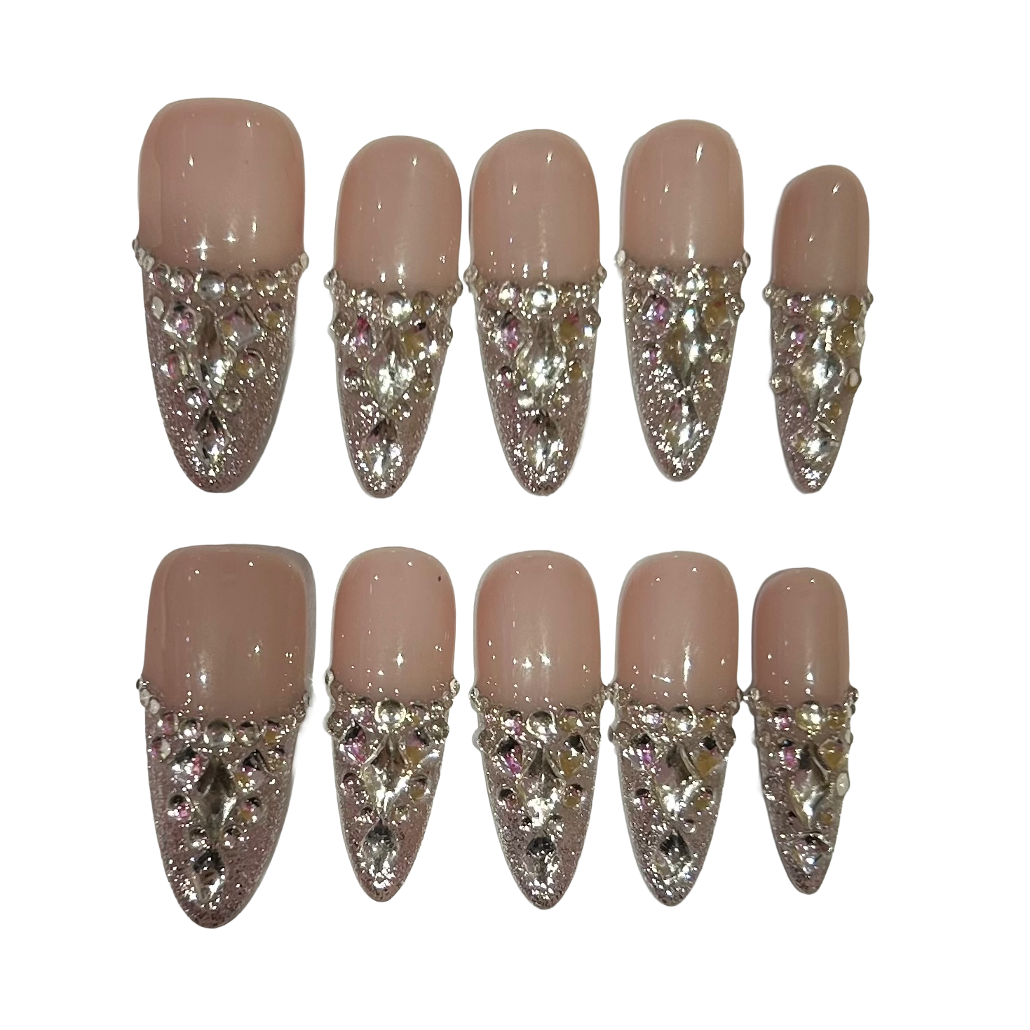 Color: A stunning nude French base, adorned with 3D silver charms.