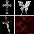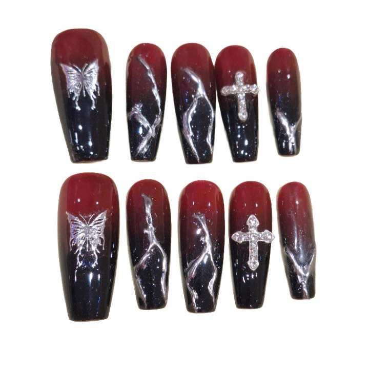 Colour: A ombre red and black base with silver detailing and butterfly and cross charms.