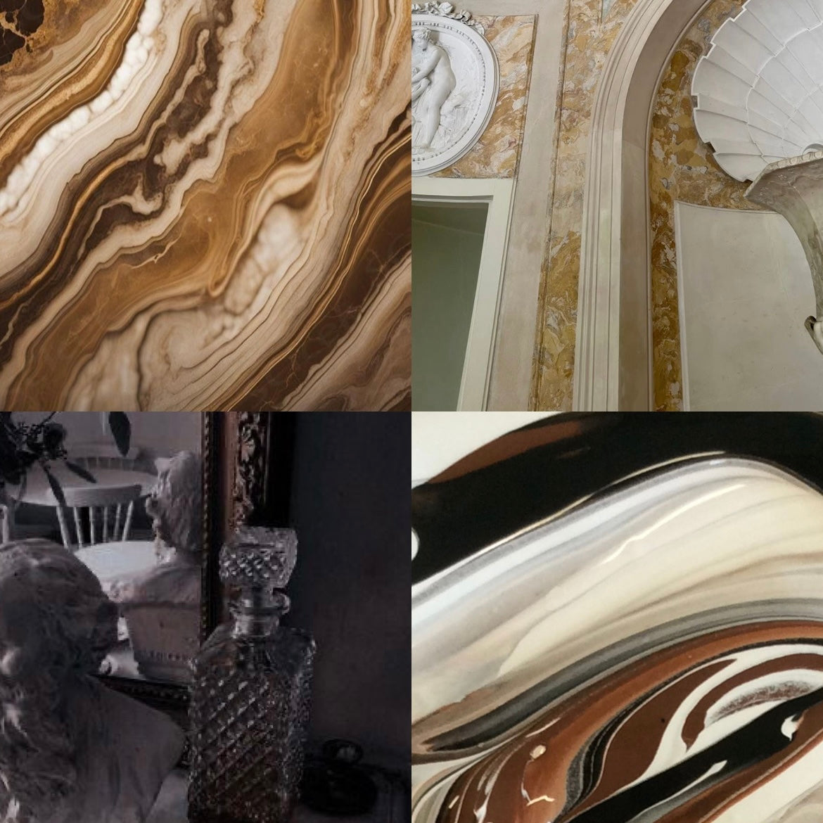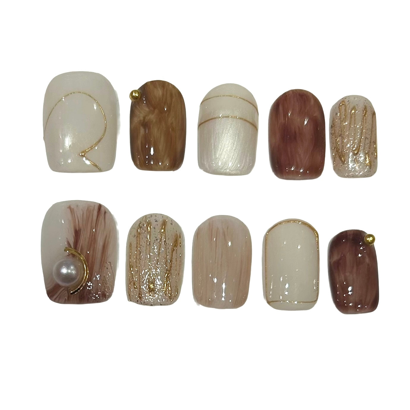 Colour: A brown and white colour pallet with a marbled effect, adorned with stunning hand painted gold details and tiny gold pearl charms.