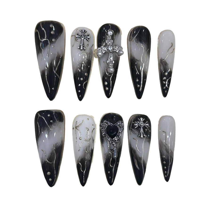 Color: A stunning black and white base, adorned with detailed blending and silver cross charms.