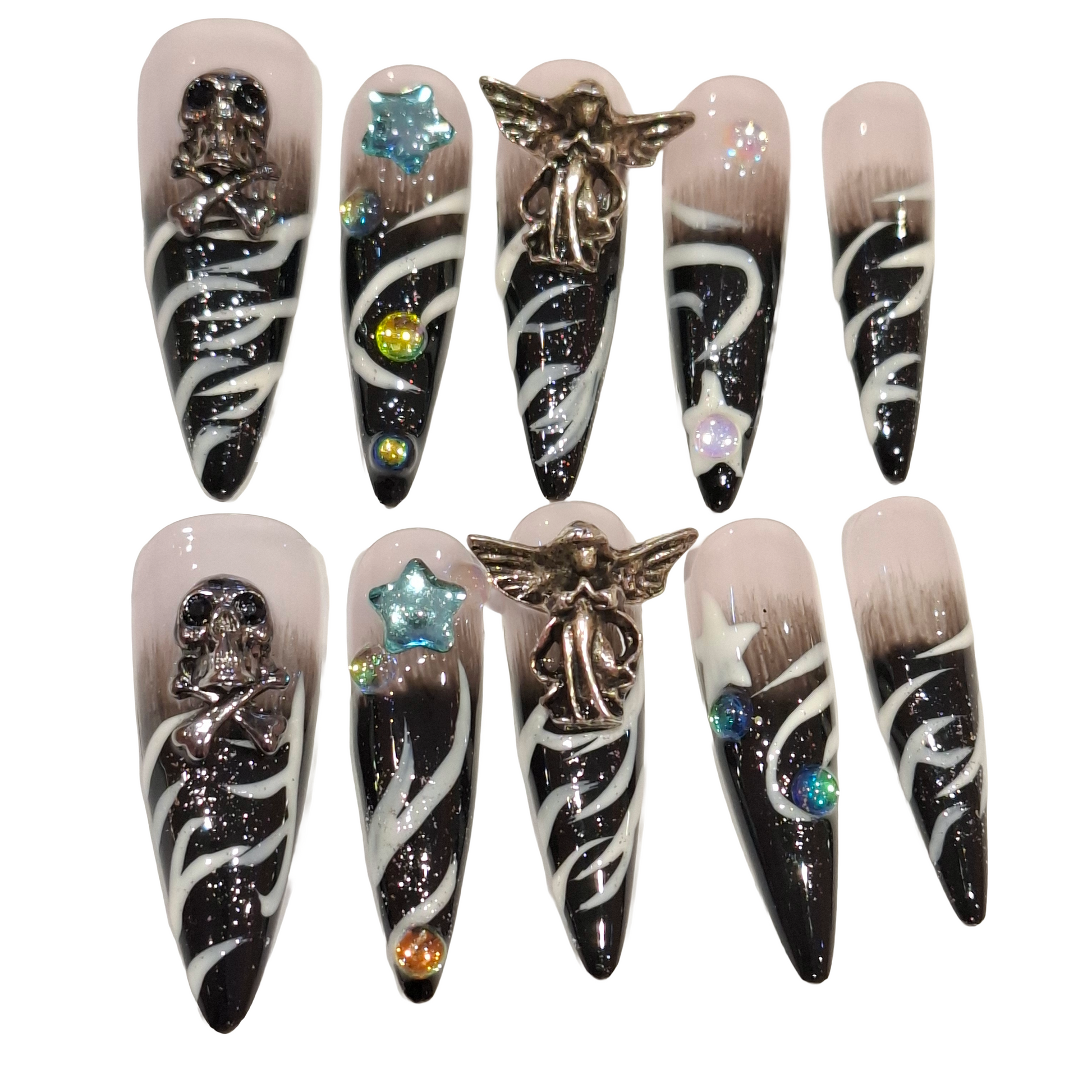 - Your Striped Skull Acrylic Stiletto press On Nails are now ready to flaunt! Enjoy your stunning, salon-quality manicure.