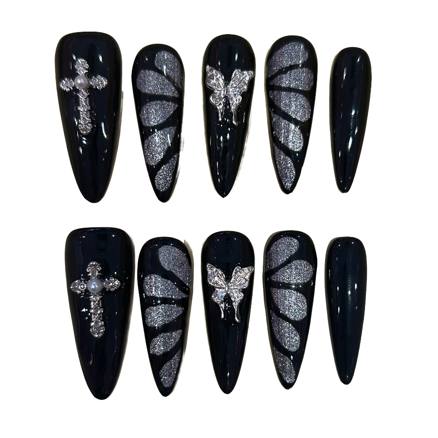 - Your Noir Papillon Acrylic Stiletto Press On Nail are now ready to flaunt! Enjoy your stunning, salon-quality manicure.