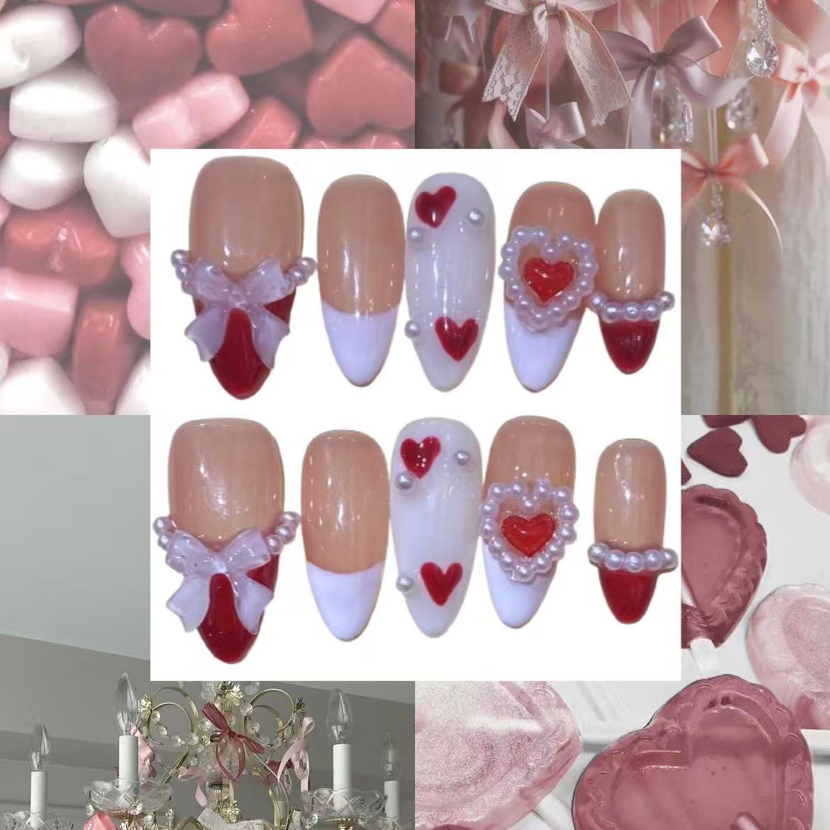 Colour: A nude base with white and red french tips, adorned with gorgeous pearl and bow charms.