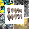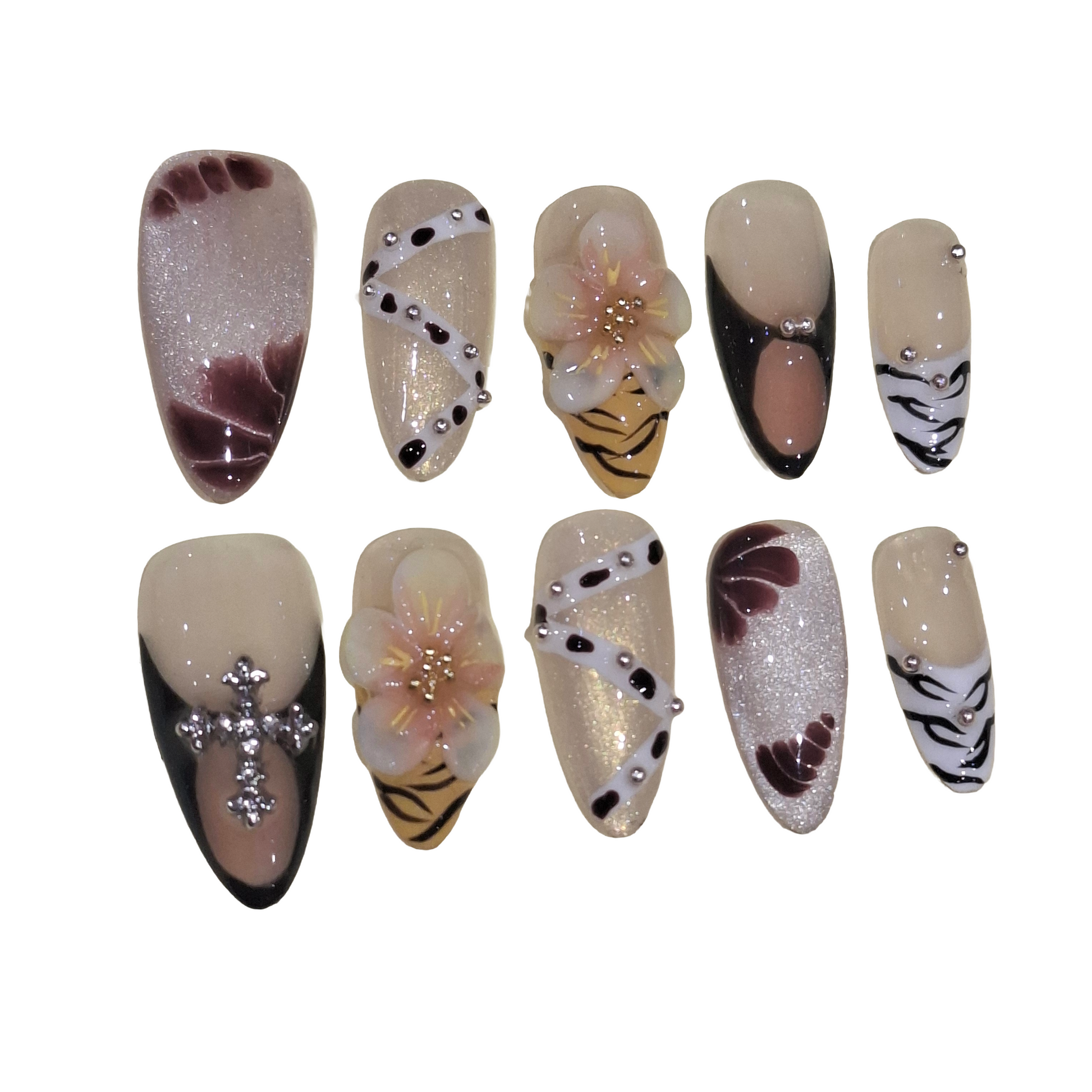 Colour: A shimmery nude base with gem detailing and a blend of floral and zebra. print painted designs.