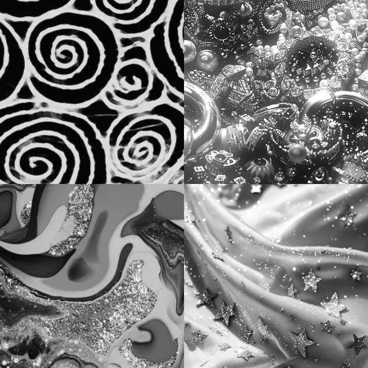 Colour: A monochrome base with intricate hand painted details with a pop of silver.
