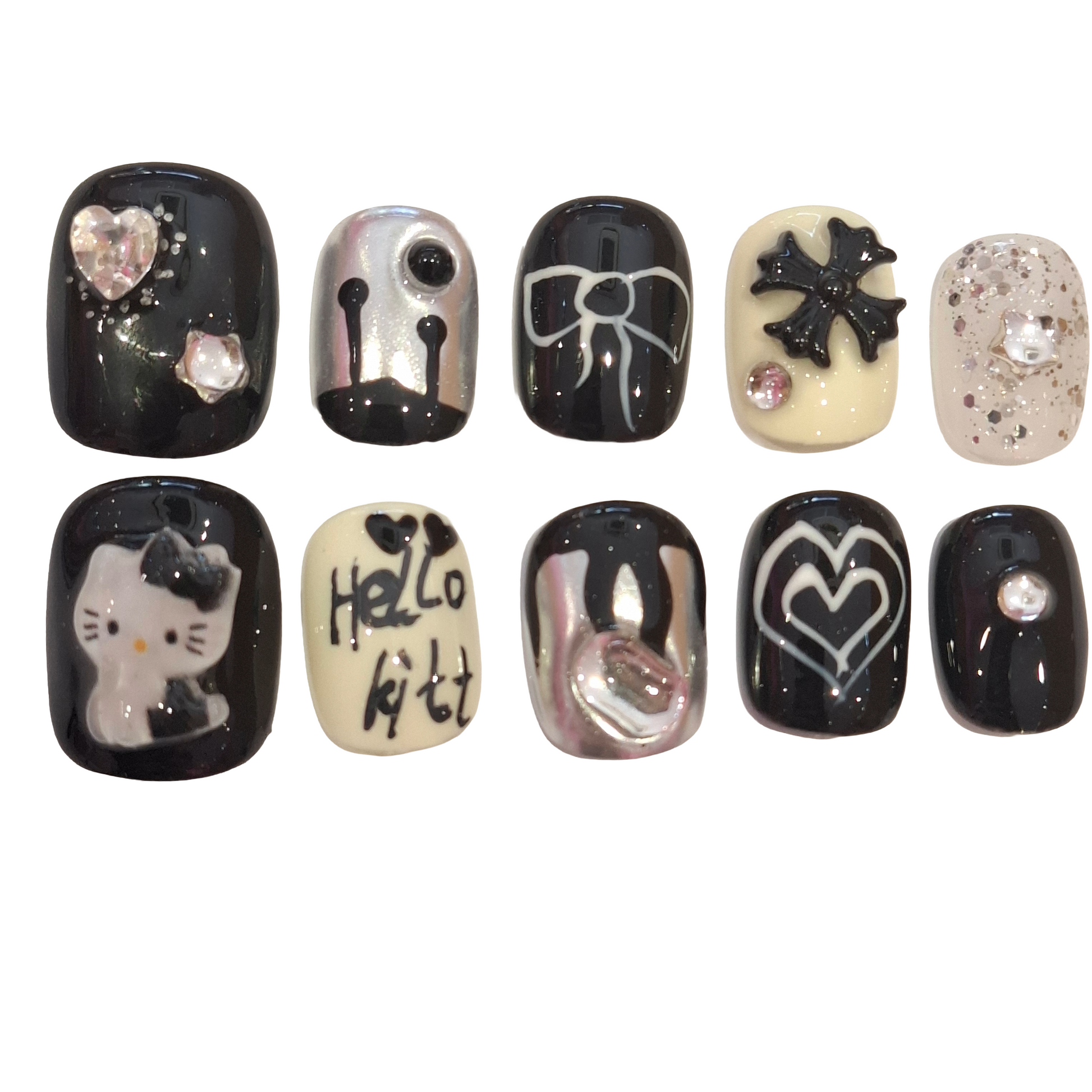 Colour: A black, silver and off-white base across each of the nails, along with chunky hello kitty and other charms,painted bow designs, glitter and small gemstone accents.