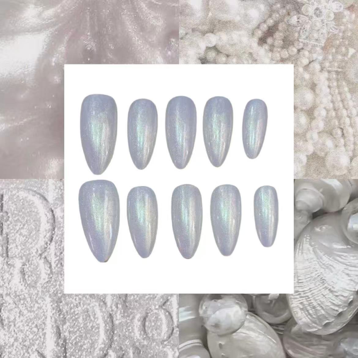 - Your White Shimmer Acrylic Almond Press On Nails are now ready to flaunt! Enjoy your stunning, salon-quality manicure.