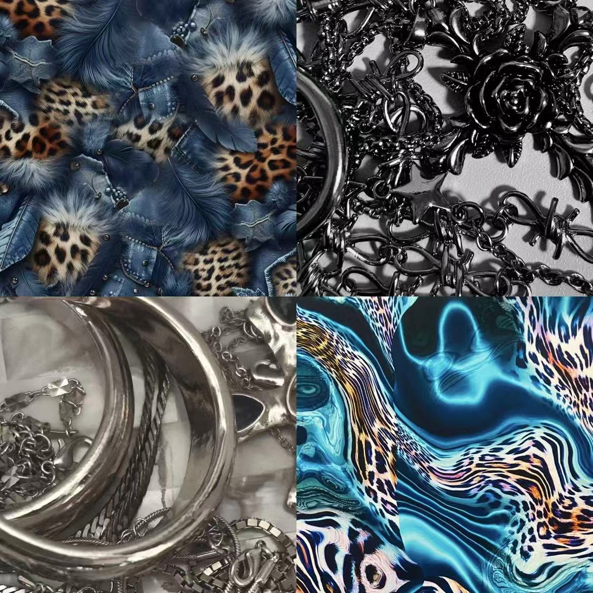 Colour: A nude base with blue animal print french tips and glamorous charms.